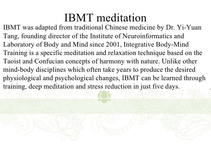 The researchers therefore chose an easier meditation technique known as integrative body-mind training (IBMT), which can be practised in a standardized way using a compact disc However, IBMT provides a short-term technique that can allow scientists to ... Retrieve Content